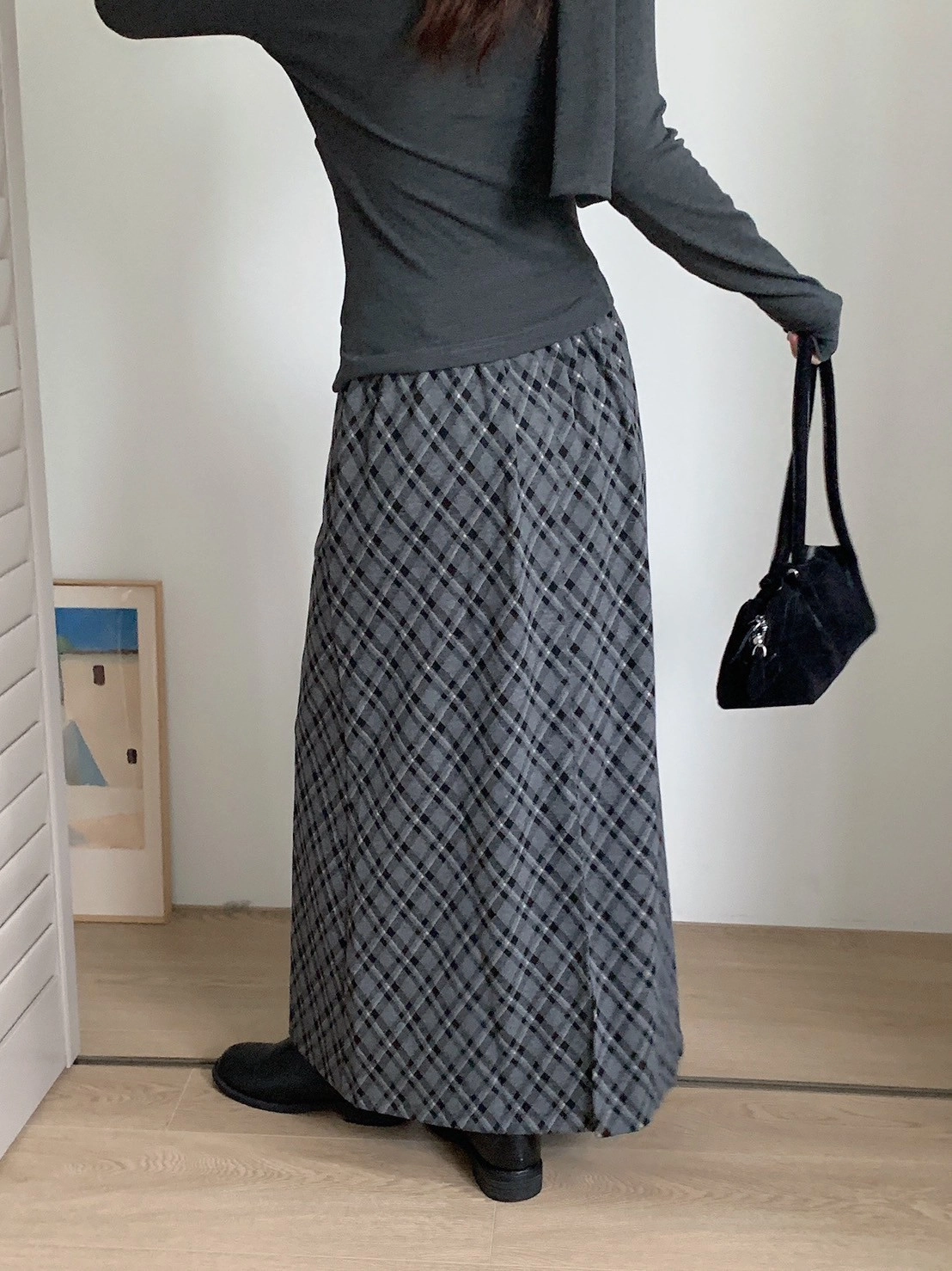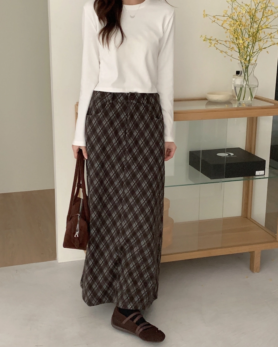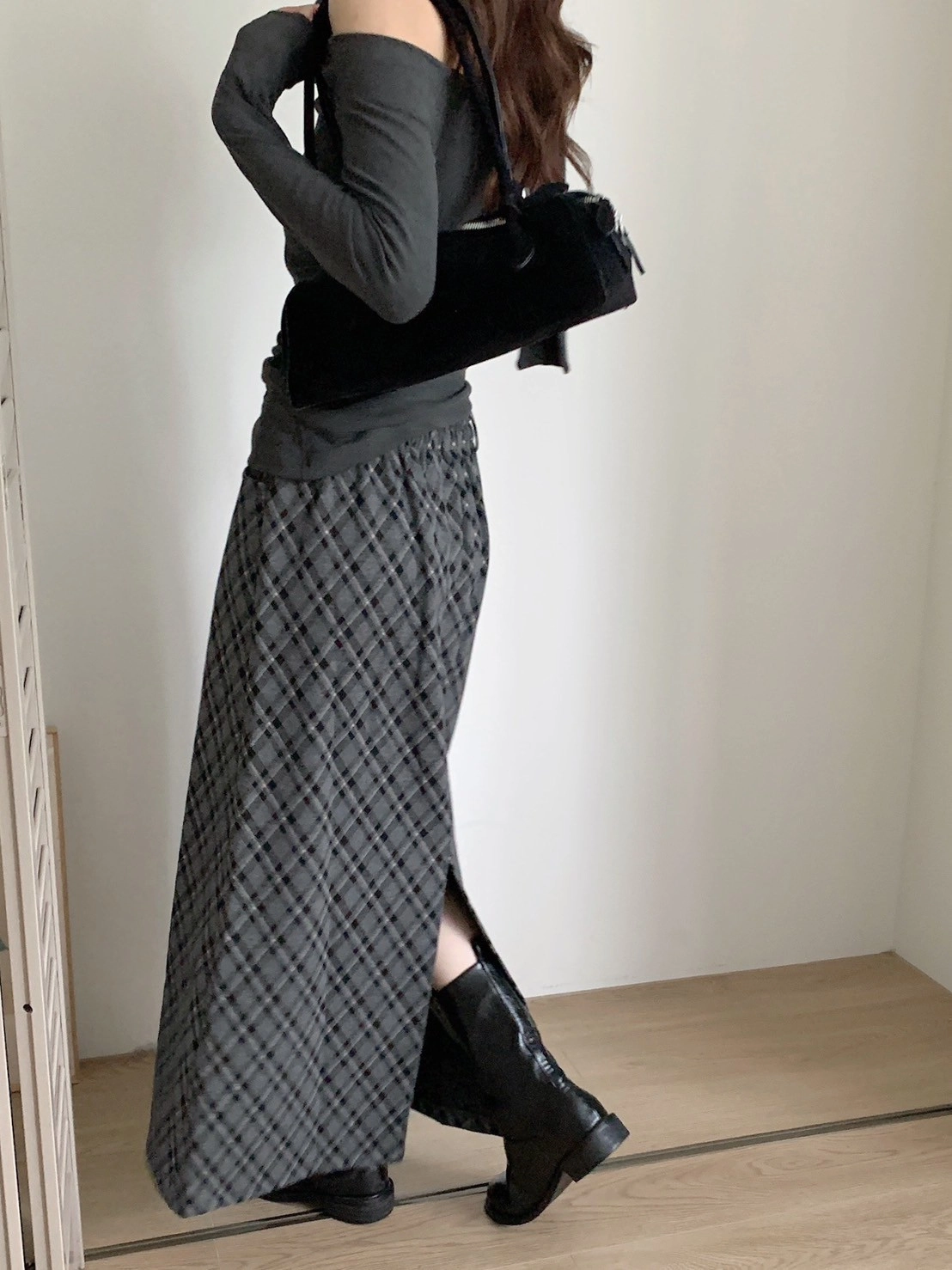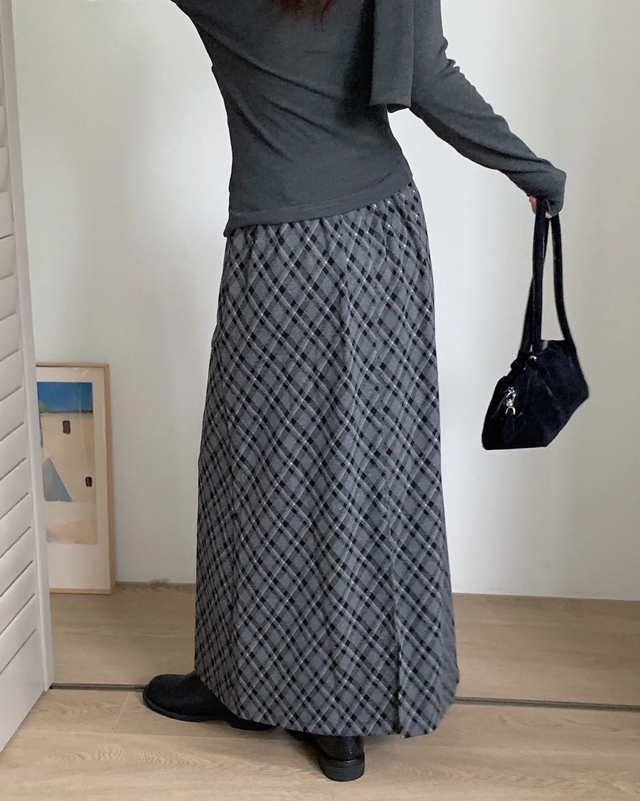 預購_後開衩格菱紋毛呢長裙