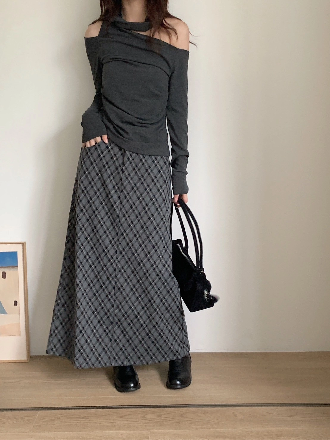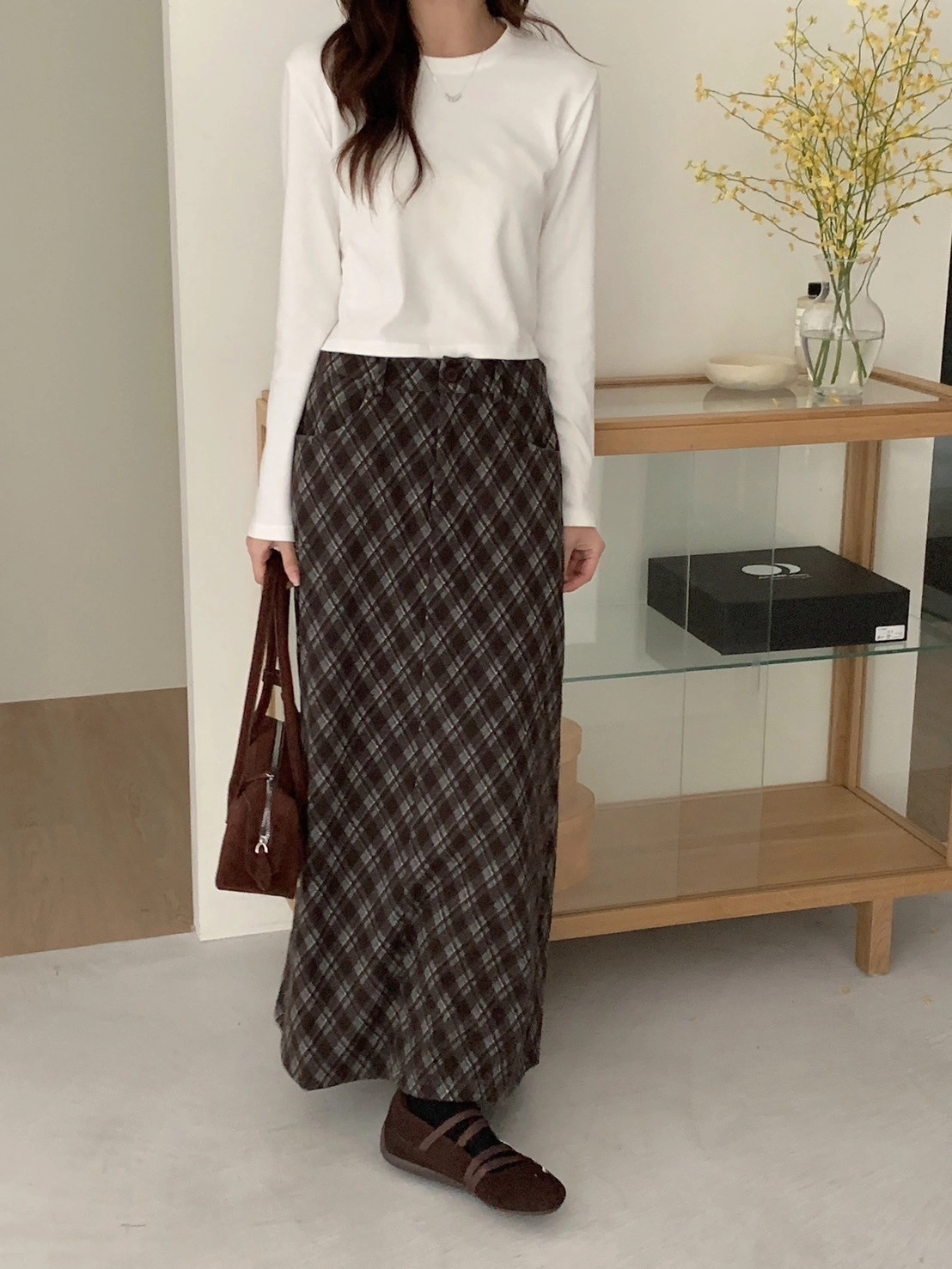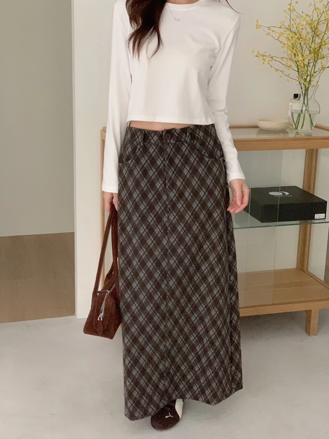 預購_後開衩格菱紋毛呢長裙
