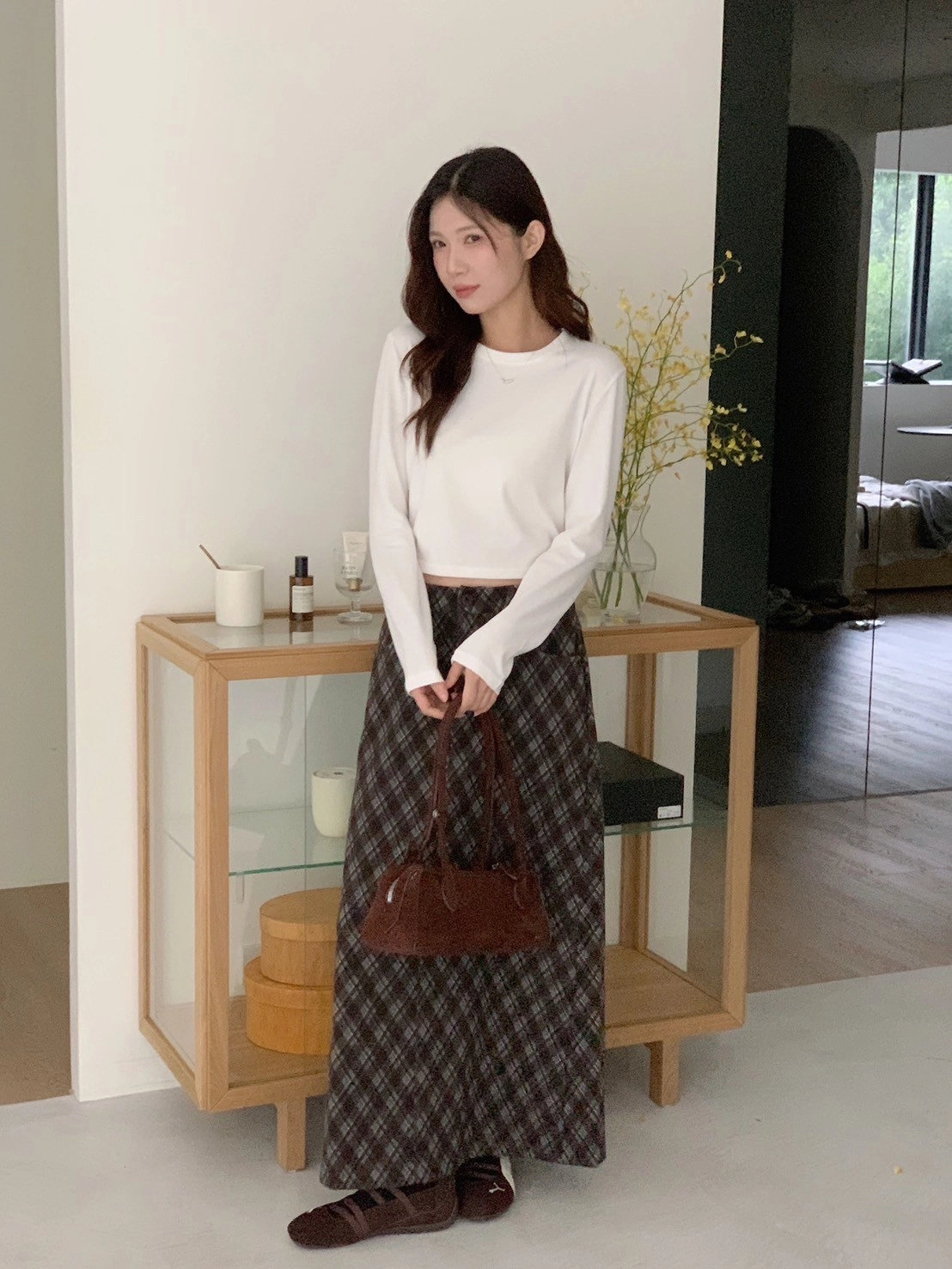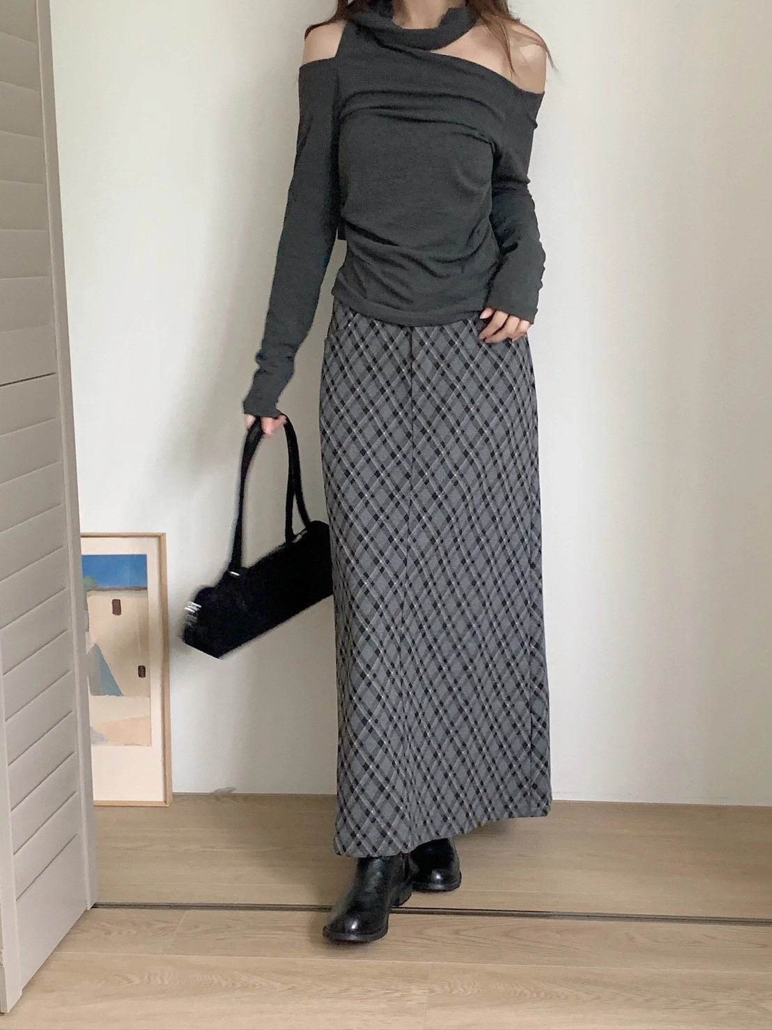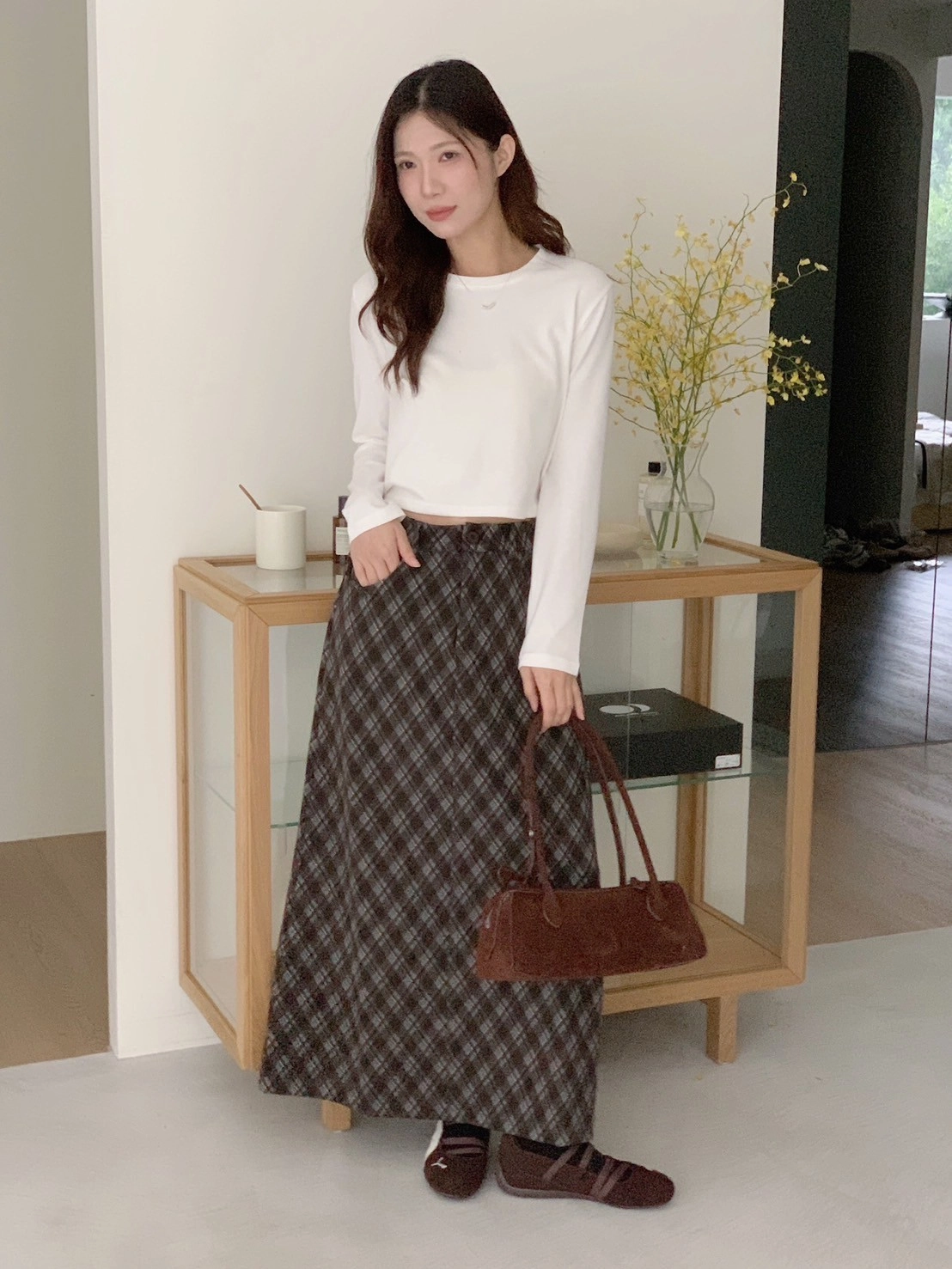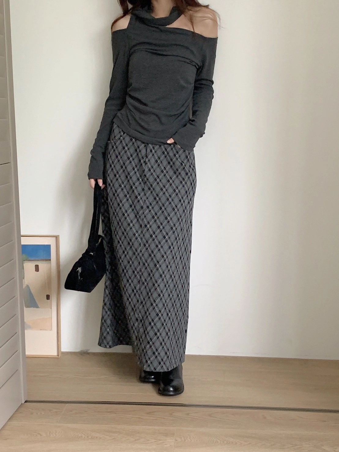 預購_後開衩格菱紋毛呢長裙