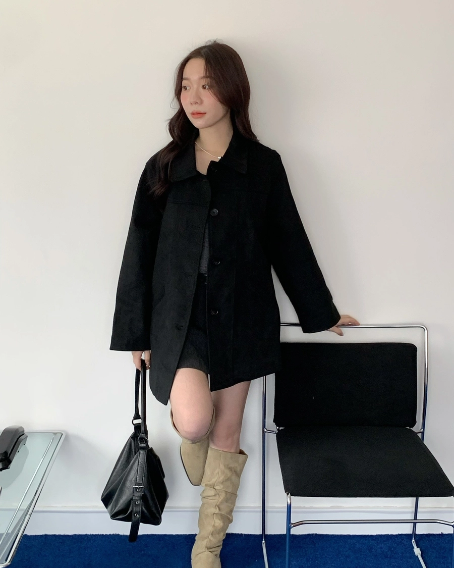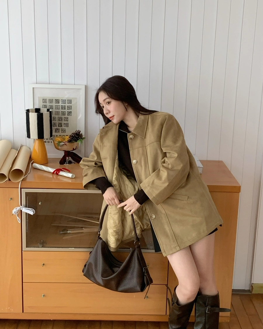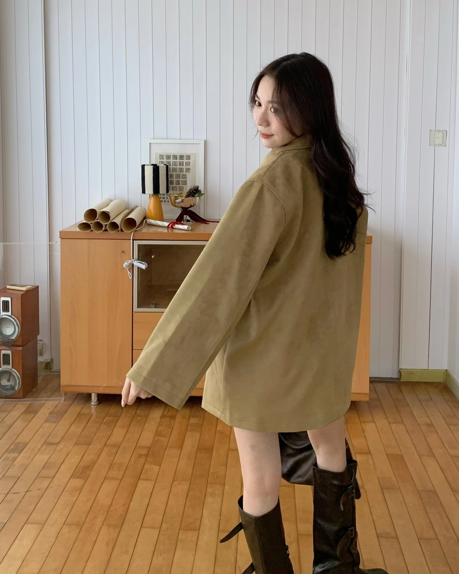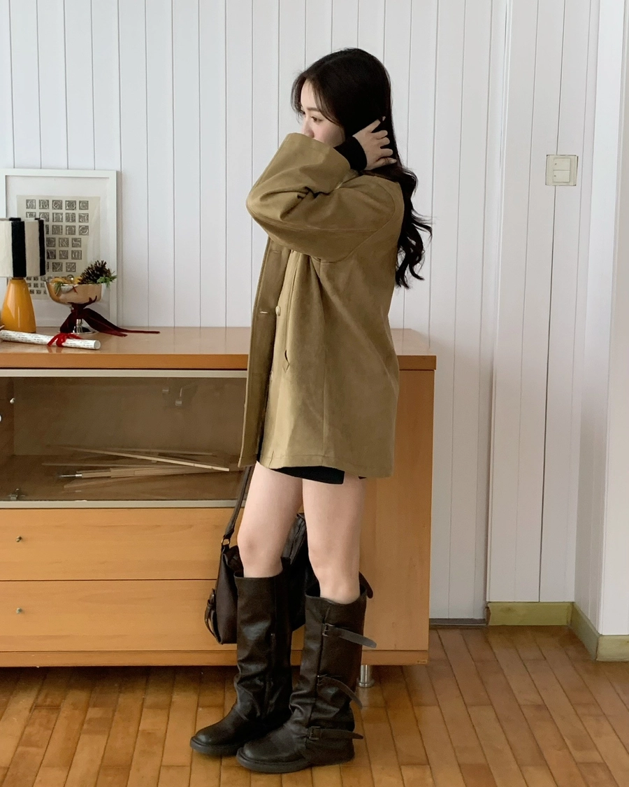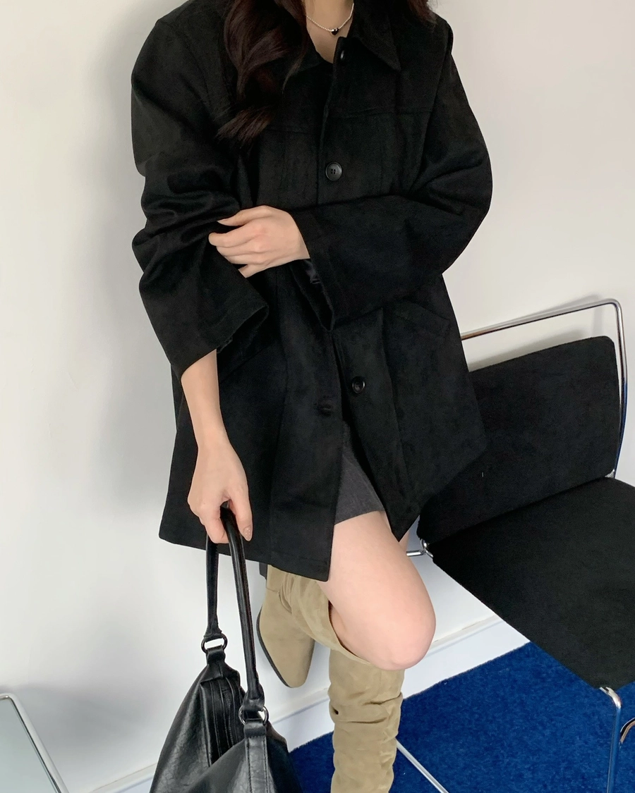 特價_蜜桃絨長版翻領排釦外套