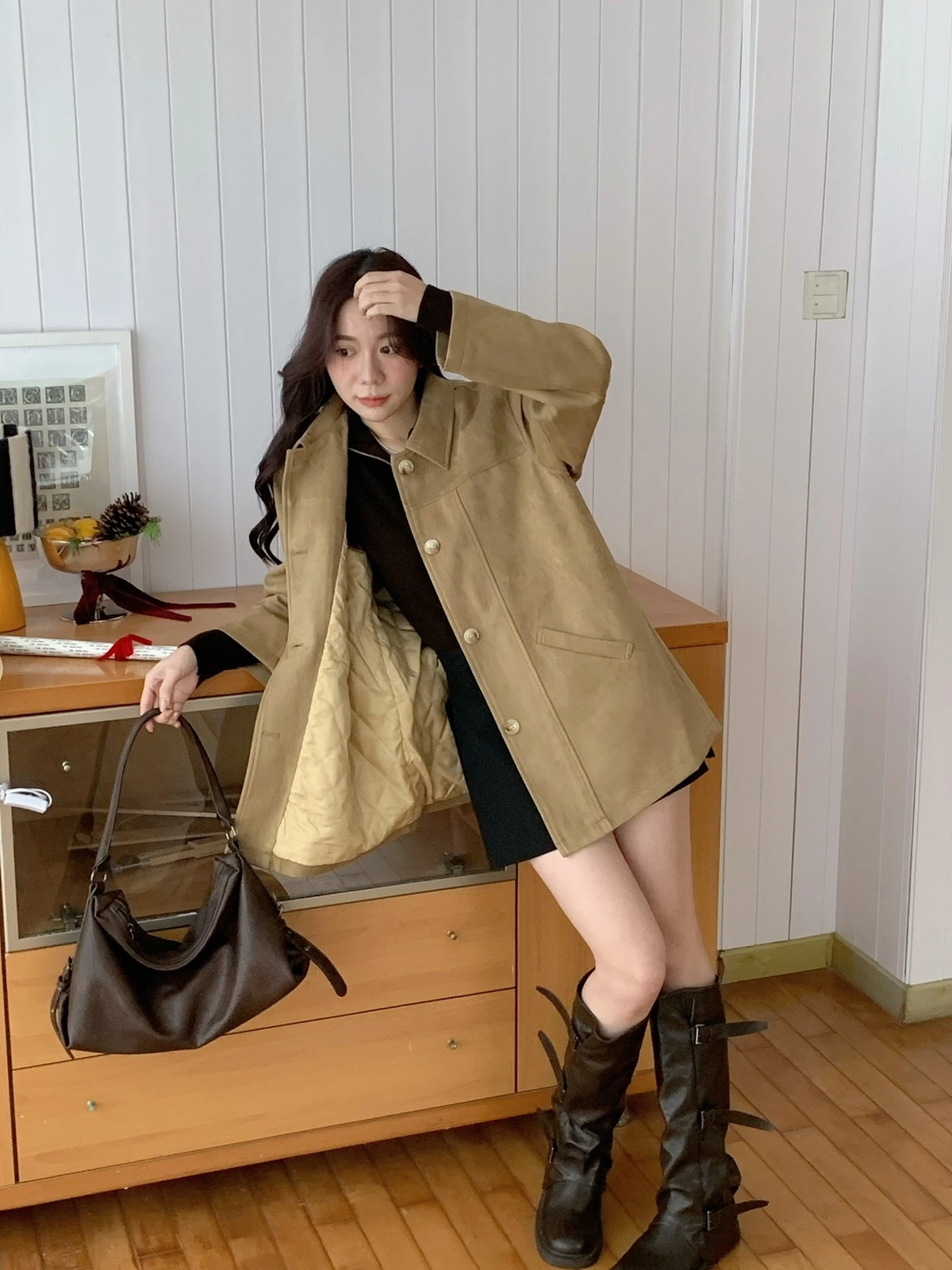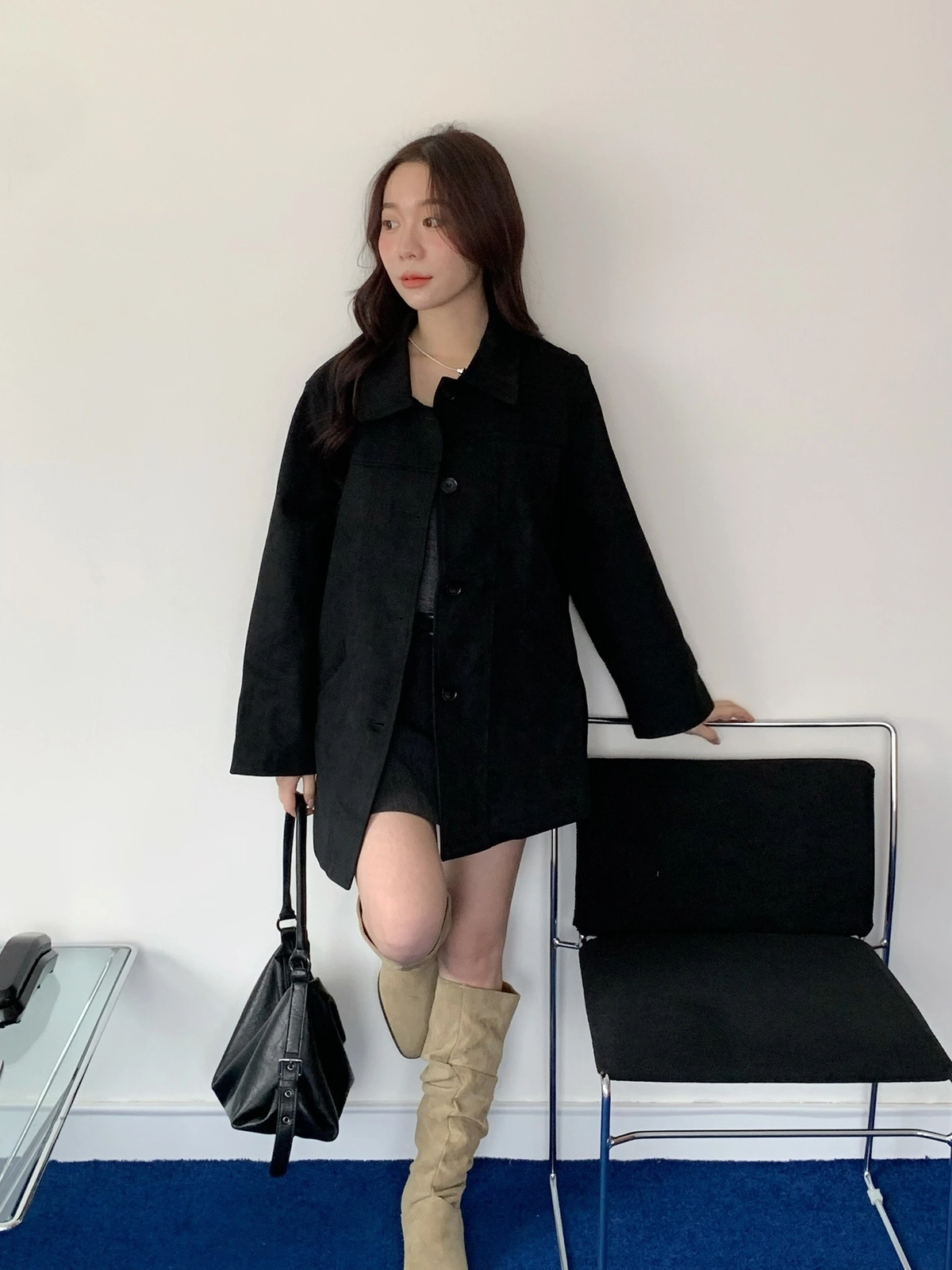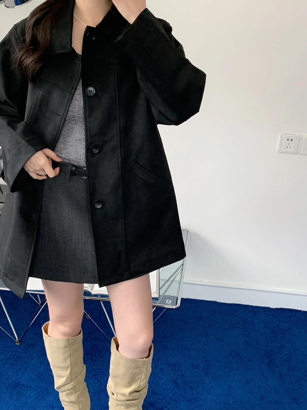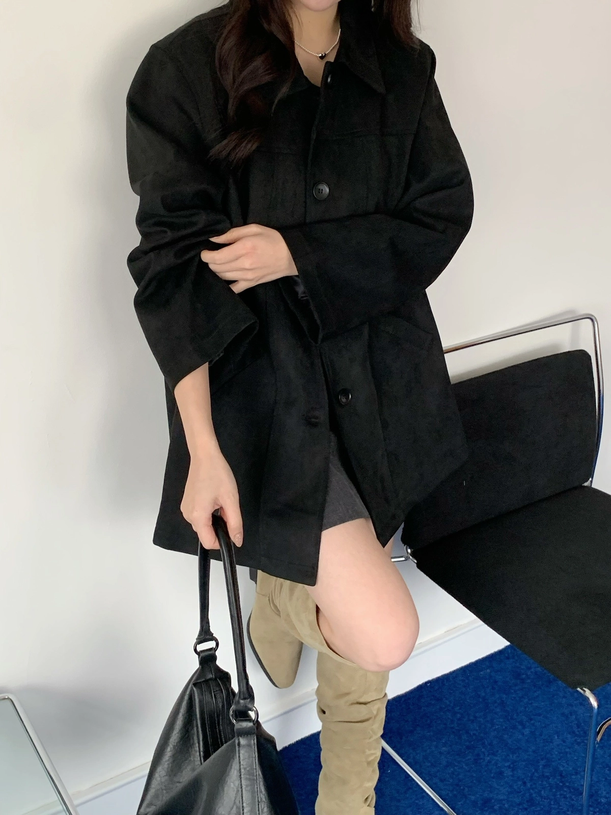 特價_蜜桃絨長版翻領排釦外套