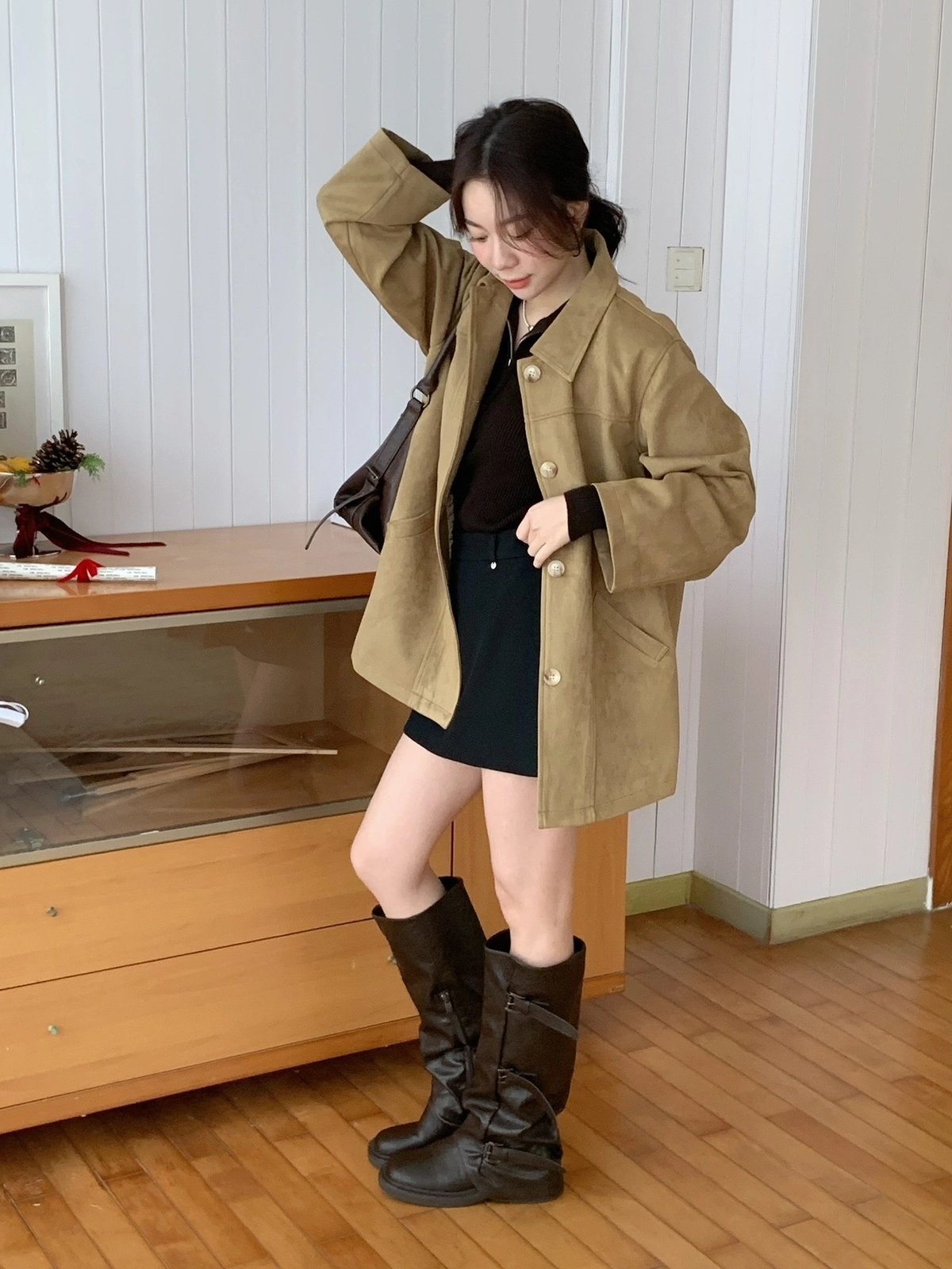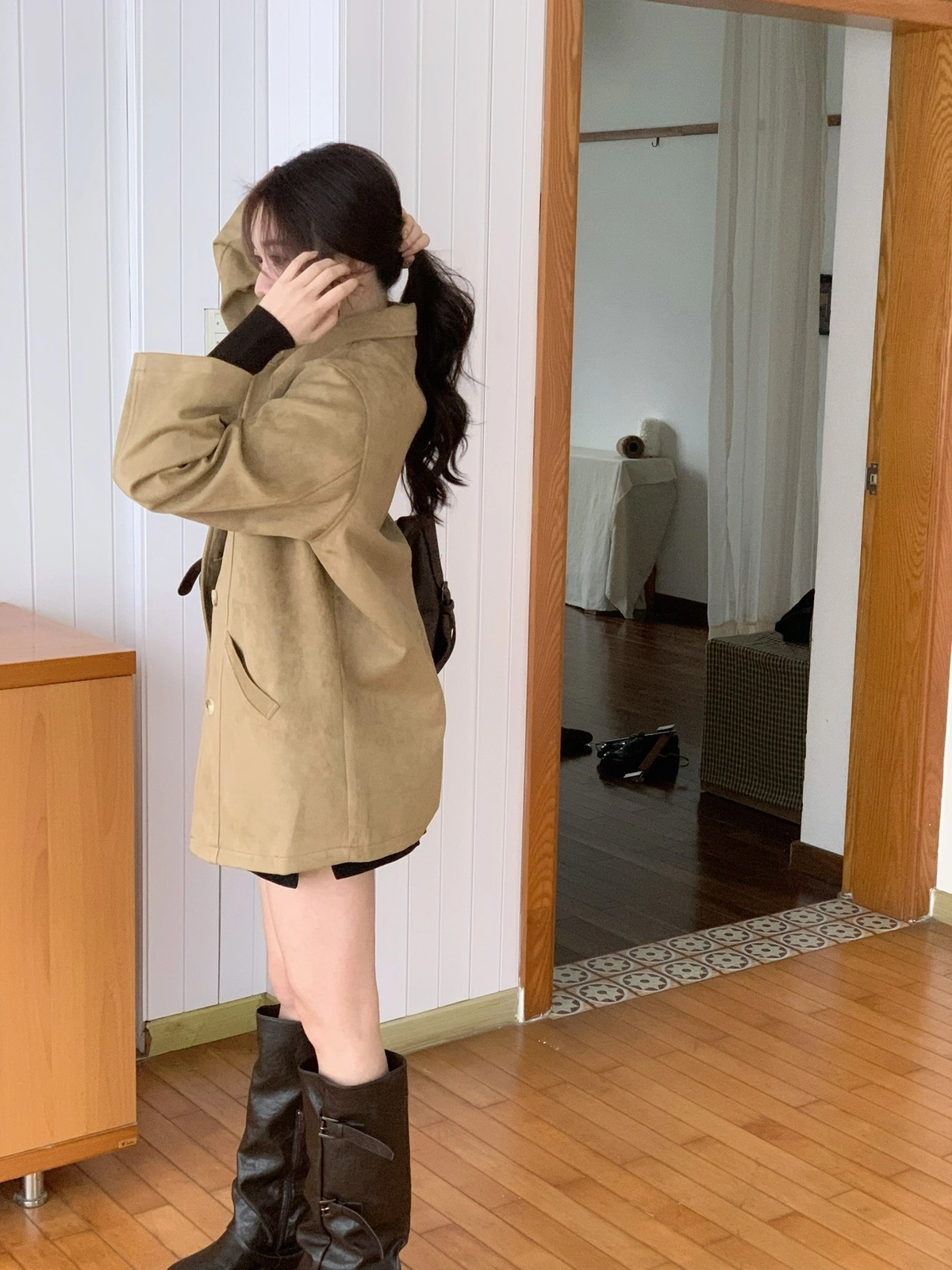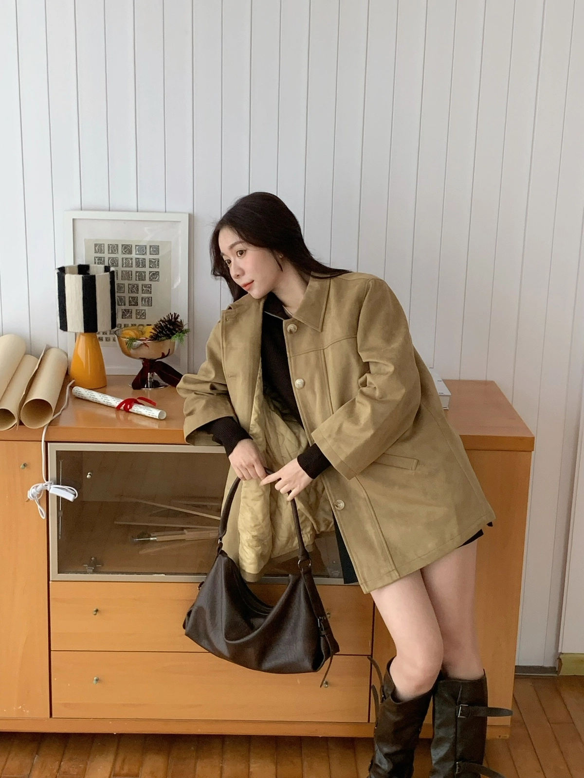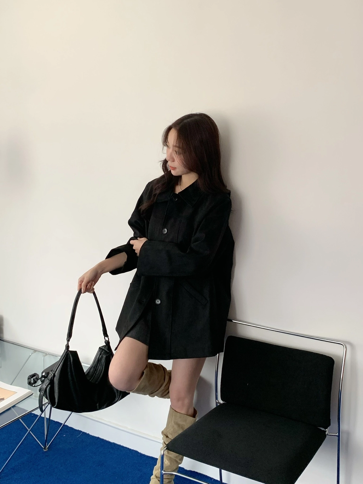 特價_蜜桃絨長版翻領排釦外套