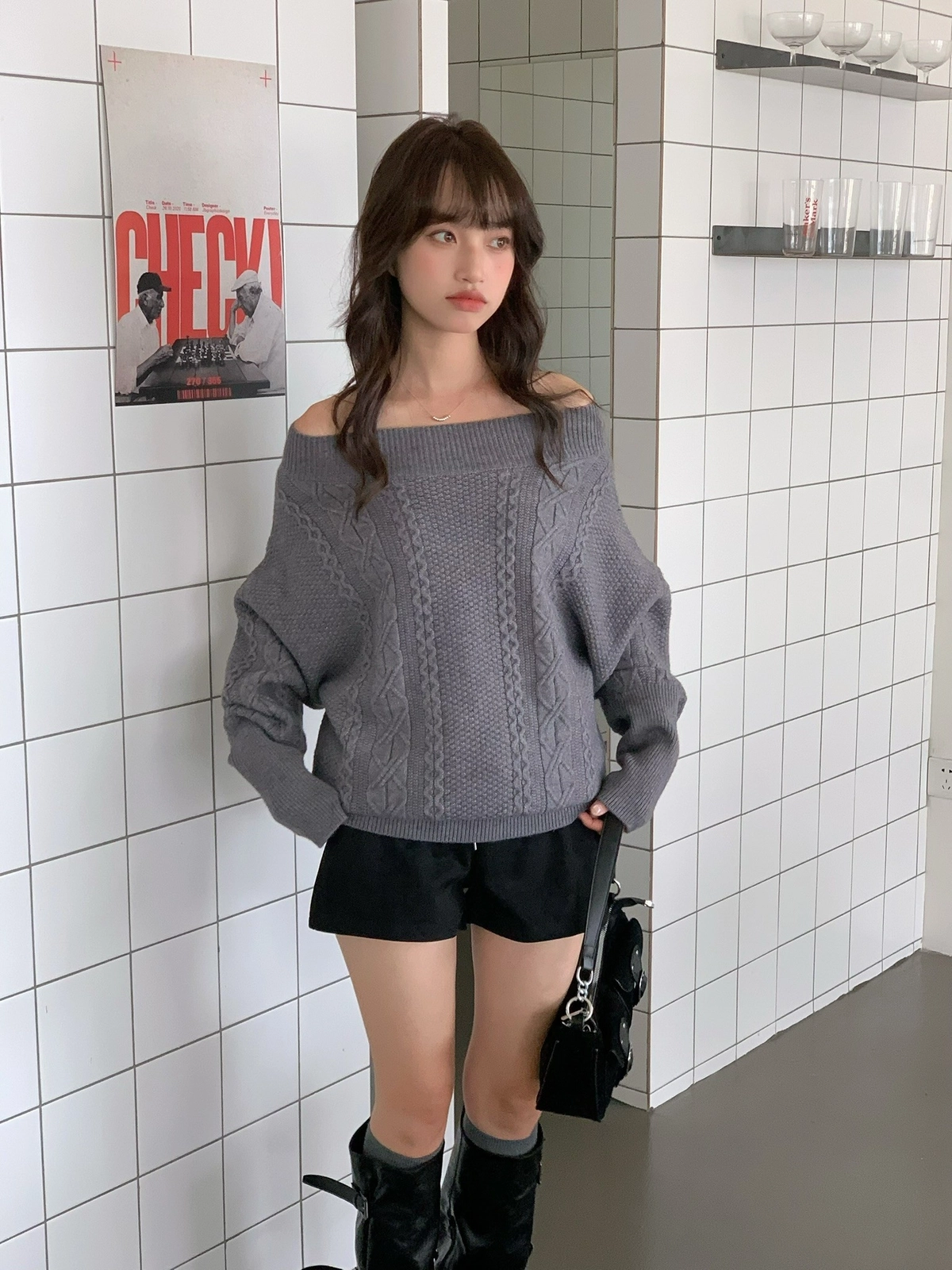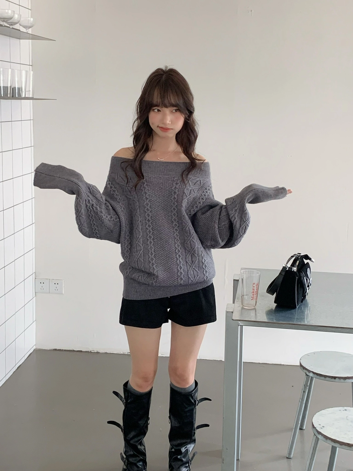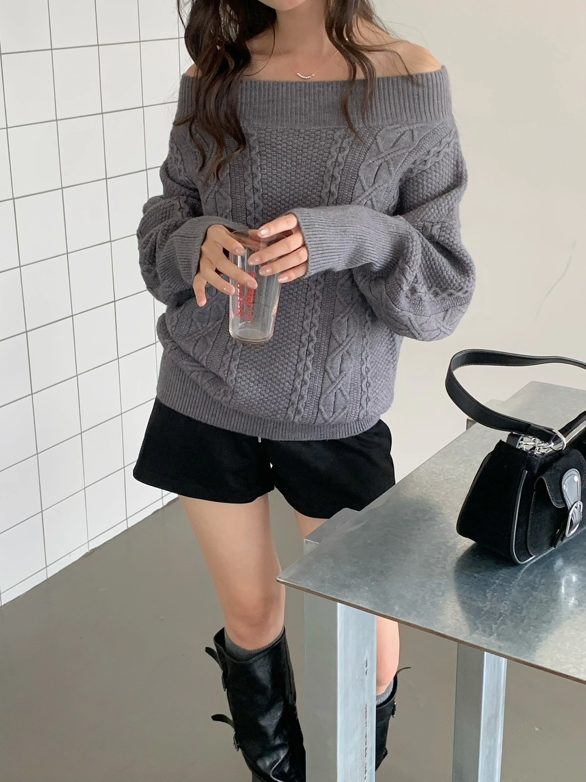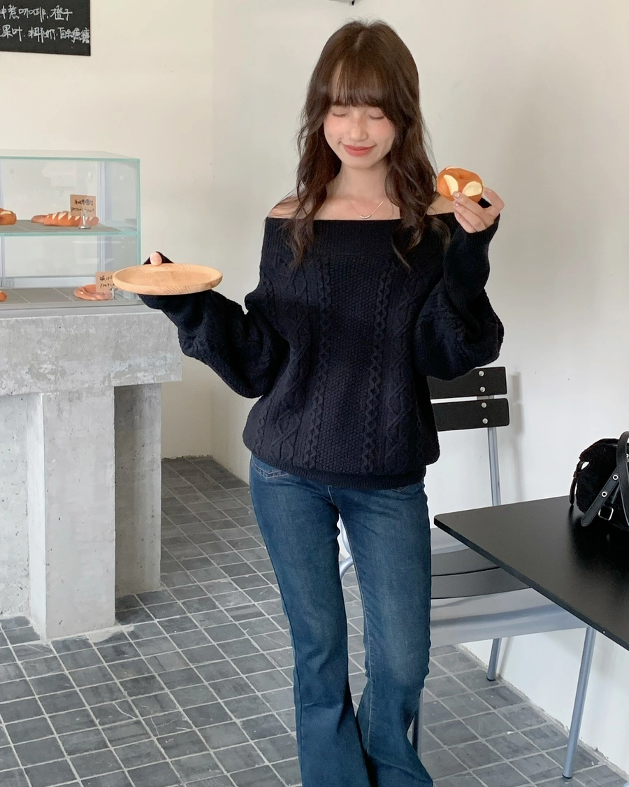 預購_特價_麻花針織一字領上衣
